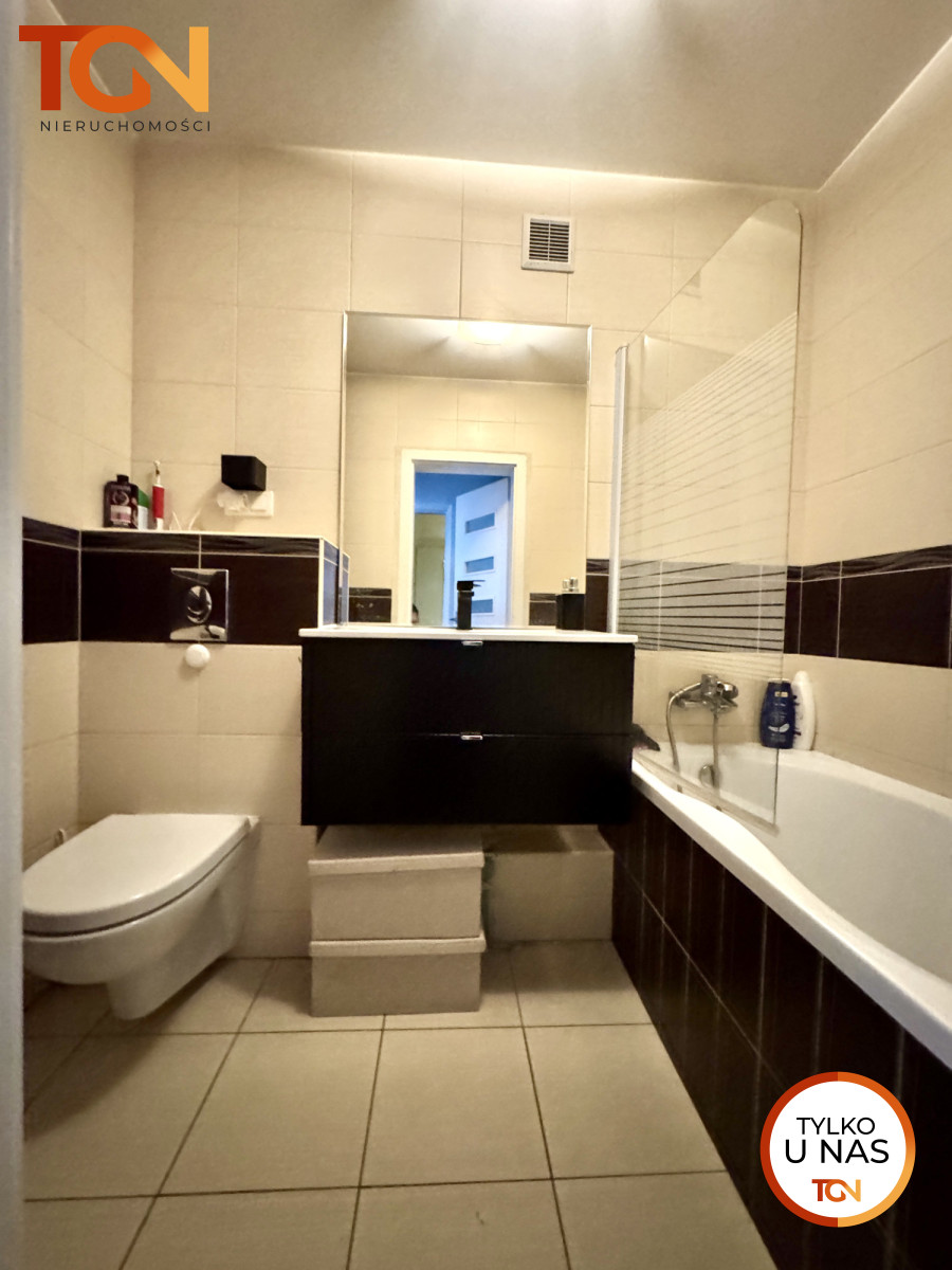 - Posiada wannę, umywalkę z szafką oraz WC.