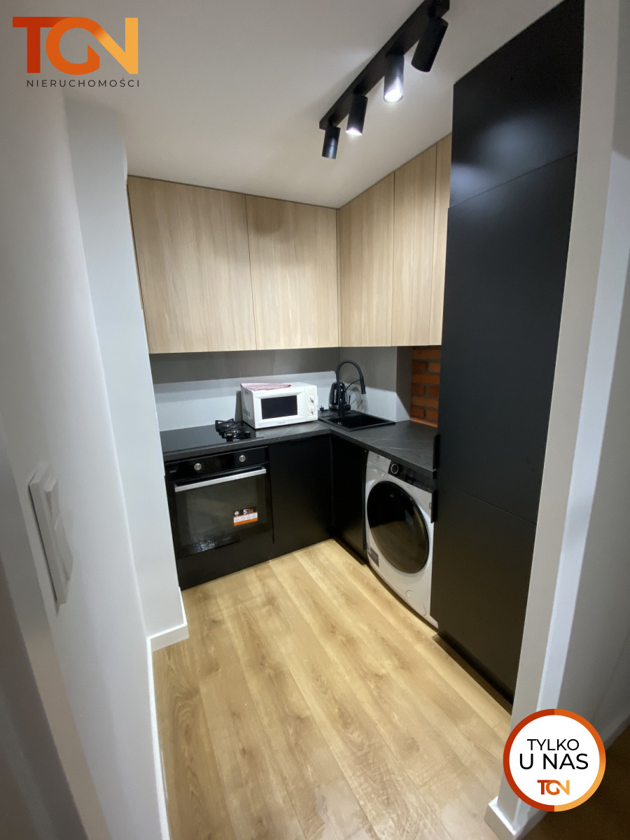 Na wyposażeniu znajduje się nowy sprzęt AGD: pralka, lodówka, piekarnik, płyta indukcyjno-gazowa.