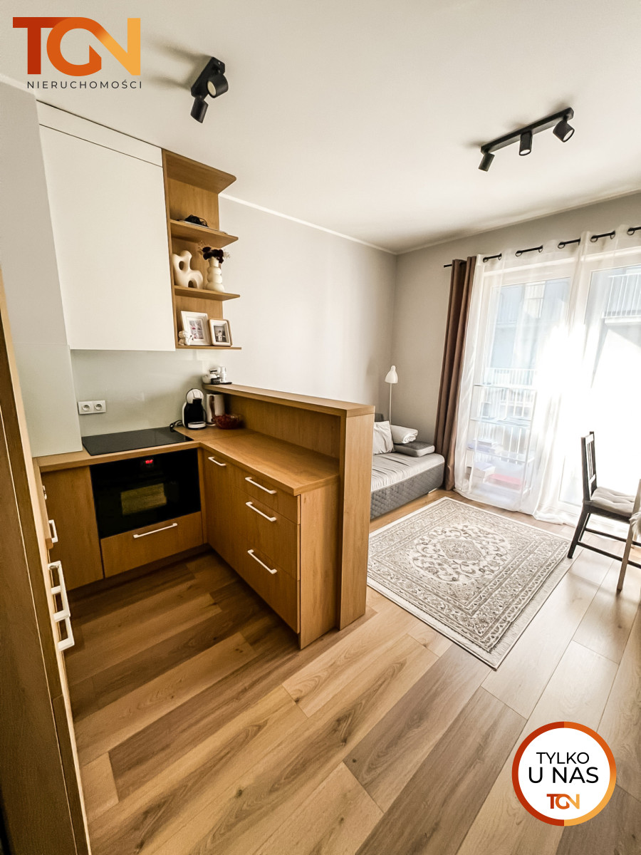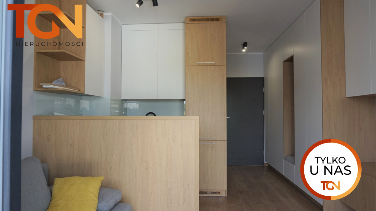 Na powierzchni 24 mkw zaaranżowano wszystko niezbędne do komfortowego mieszkania. Liczne i pojemne szafy, zabudowa kuchenna z pełnym sprzętem( duża lodówka, zmywarka, piekarnik z mikrofalą, okap) czy wygodne łóżko z funkcją spania sprawiają, że mieszkanie tutaj będzie przyjemnością. Dodatkowo wszystko zaaranżowano w nowoczesnej kolorystyce.
