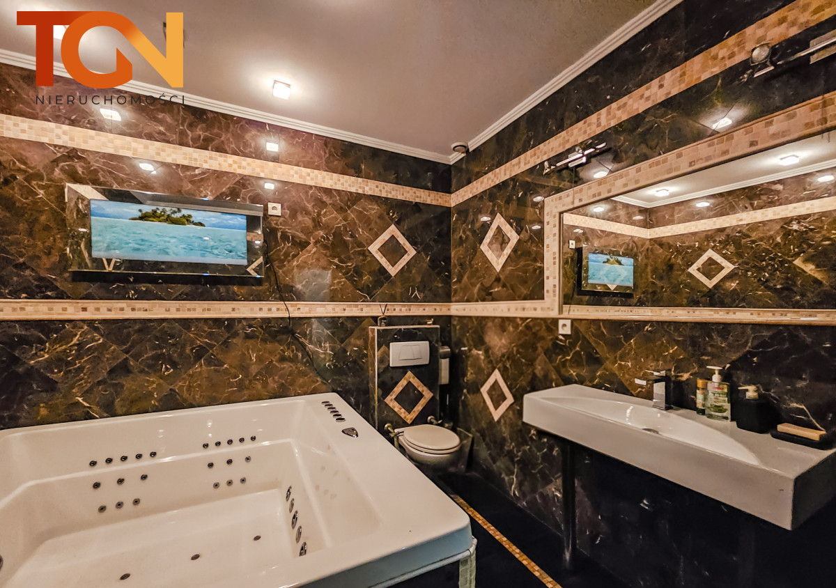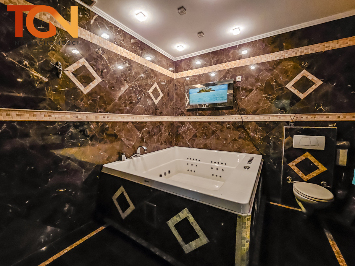 Parter: garaż na dwa samochody, hol, trzy pokoje, łazienka, jacuzzi, pralnia