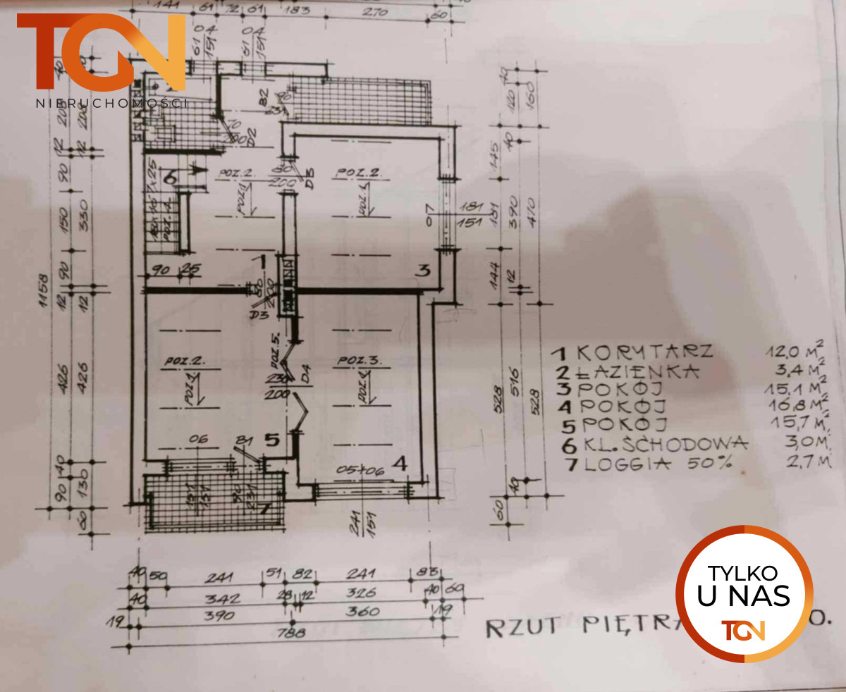 Na piętrze znajdują się trzy pokoje (16,8 m2, 15,7 m2 i 15,1 m2) w tym jeden z wyjściem na loggię (2,7 m2), łazienka (3,4 m2) i schody na poddasze.