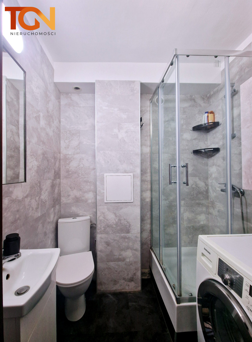 -funkcjonalnej łazienki z prysznicem, pralką i suszarką,