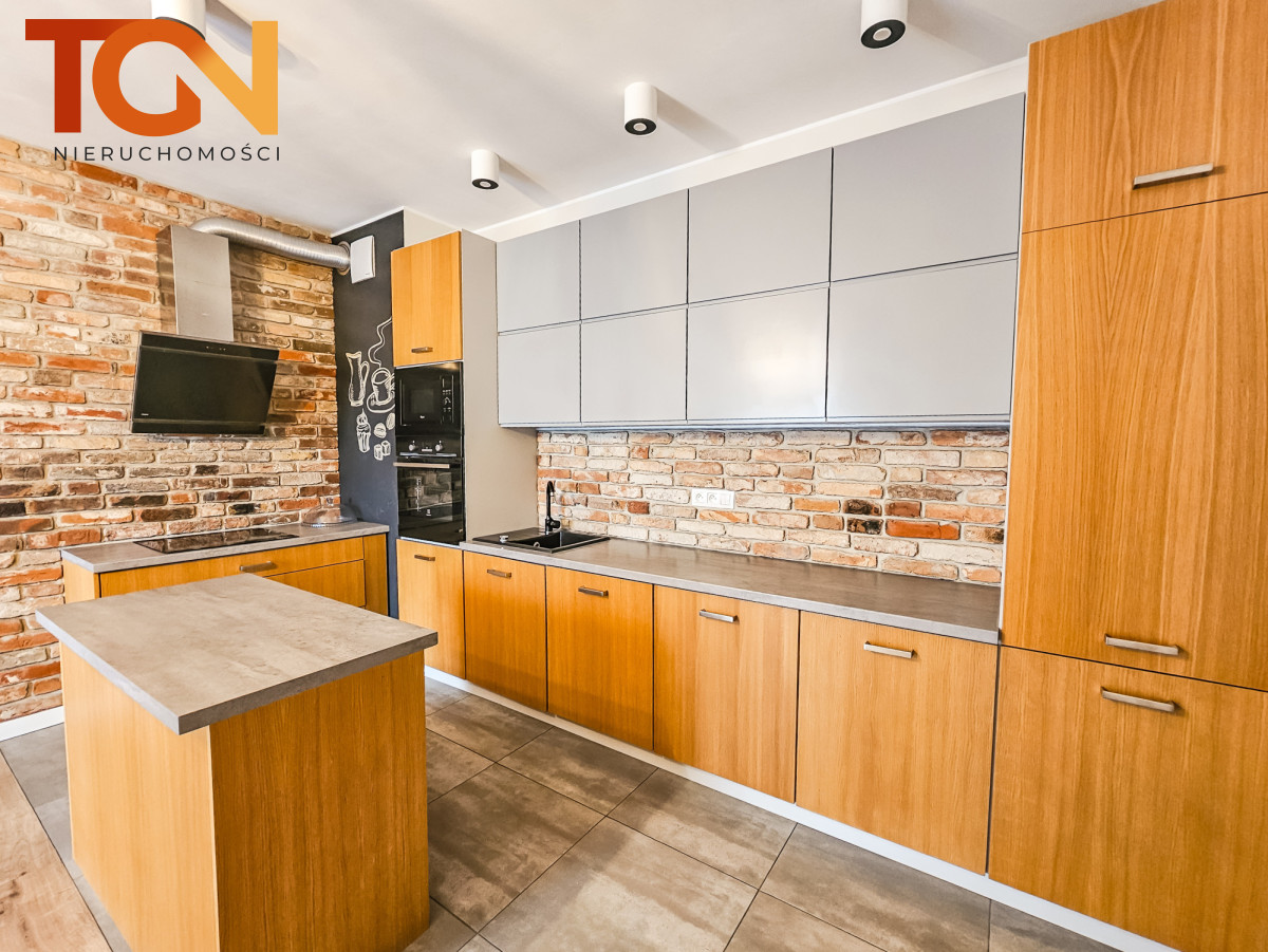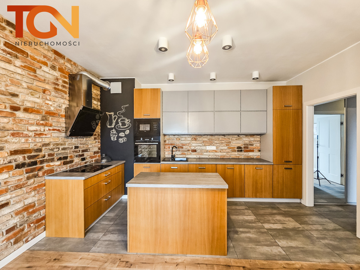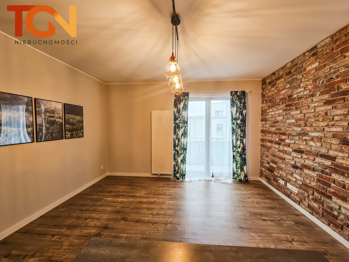 - W salonie ściana wykończona oryginalną, starą cegłą, co nadaje wnętrzu niepowtarzalny charakter.