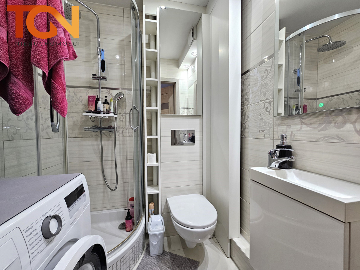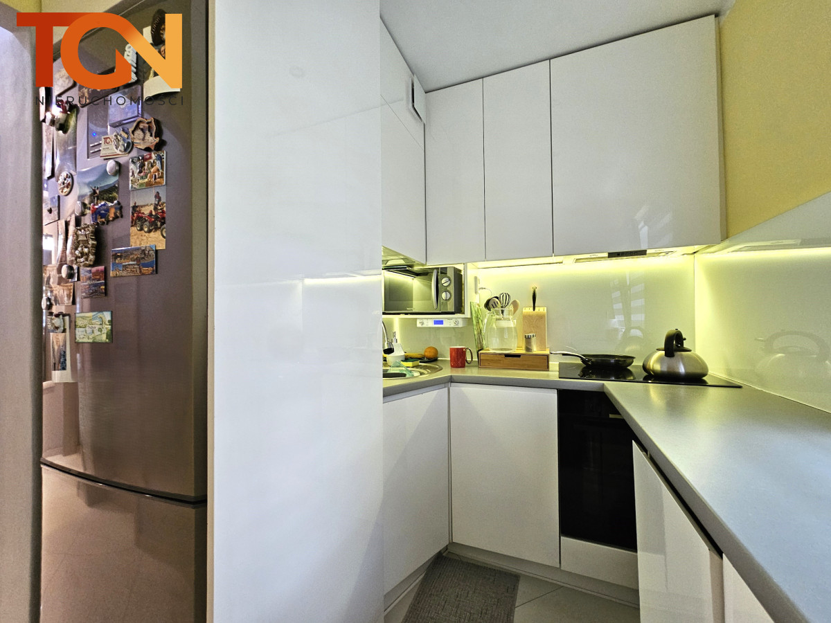 W kuchni znajduje się płyta indukcyjna, piekarnik, mikrofala i lodówka. W łazience umieszczono pralkę oraz prysznic z deszczownicą.