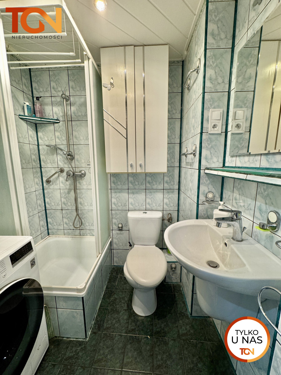 - Łazienka z WC, wyposażona w kabinę prysznicową oraz miejsce na pralkę.