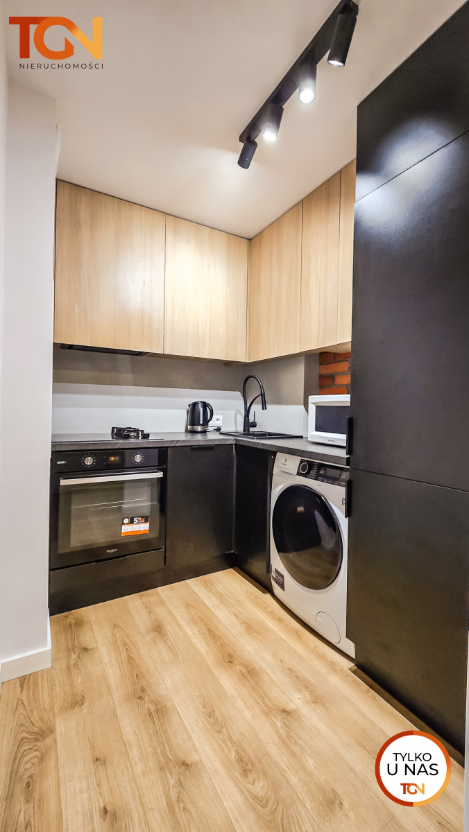 Na wyposażeniu znajduje się nowy sprzęt AGD: pralka, lodówka, piekarnik, płyta indukcyjno-gazowa.